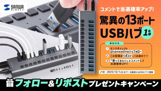 話題の新商品、「驚異の13ポート搭載!スイッチ付きUSBハブ(400-HUBA50GM)」が1名様に当たる、Xプレゼントキャンペーンを11月21日(金)12:00より開催します!