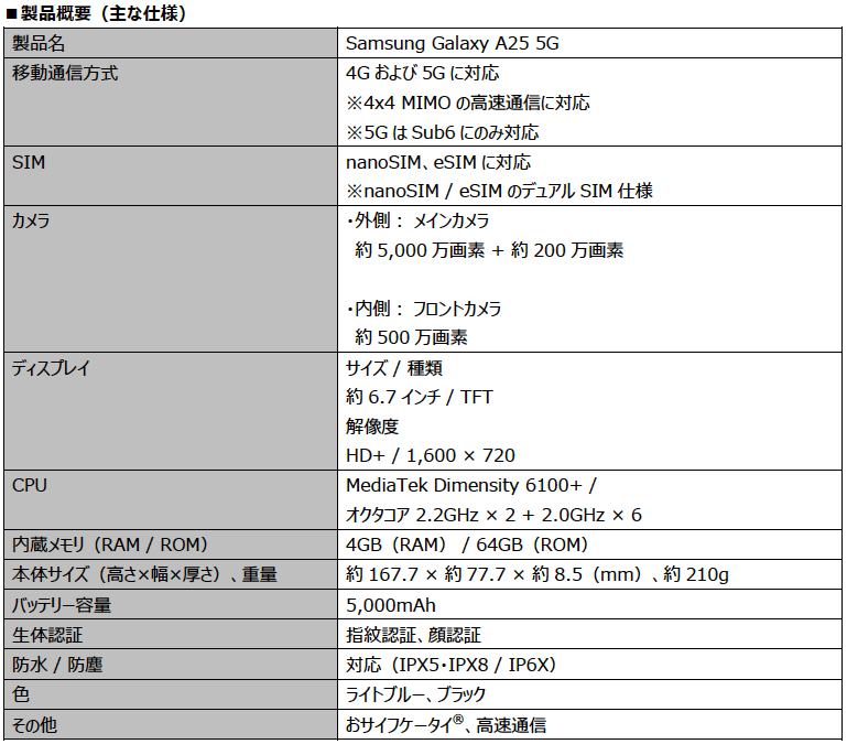 楽天モバイル株式会社(以下「楽天モバイル」)は、「Samsung Galaxy A25 5G」を、本日11月20日(木)午前9時より「楽天モバイル」公式サイトにて、また11月27日(木)より「楽天モバイルショップ」にて、製品価格22,001円(税込)で発売します(注1)。本製品は、大画面で快適な操作性、大容量バッテリー、あんしん機能を備えた5G対応スマートフォンです(注2)。