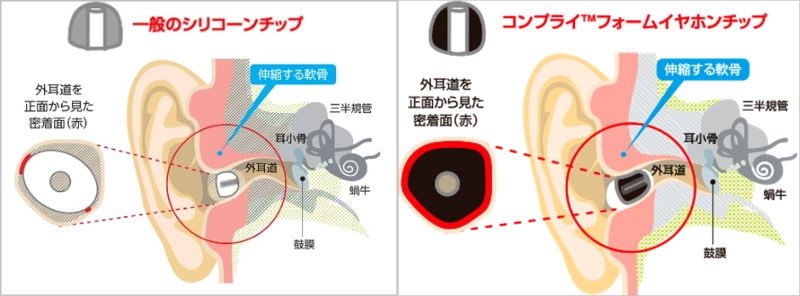 一般のシリコーン製イヤーピースや他社イヤーピースは固さが一定で体温による順応性は無く、外耳道とイヤーピースの間に多くの隙間ができるため、音漏れやズレが生じやすく、音質の低下や耳の痛みの原因となります。COMPLY(TM)製品の最大の特徴でもある「低反発ポリウレタン」はシリコーンより30倍柔らかく、順応性が高いため、体温に反応して着用する人それぞれの耳の形、口の開閉による顎の骨の動きに合わせてフィット、他社商品には無い究極の密着性を実現します。