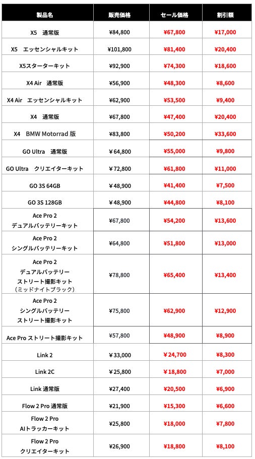 本セールでは、最新機種の360度全景カメラ「X4 Air」やポケットサイズの4Kアクションカメラ「GO Ultra」をはじめ、大人気の「X5」や8Kアクションカメラ「Ace Pro 2」をといった製品を、特別価格でご提供いたします。