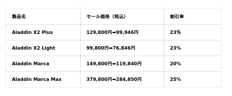Aladdin X株式会社は、2025年11月21日(金)~12月1日(月)開催のAmazonブラックフライデーおよび、 2025年11月20日(木)~11月27日(木)開催の楽天市場のブラックフライデーにて、対象製品最大25%OFFとなるセールを開催します。