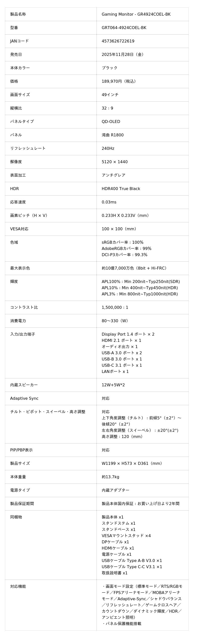 【GRAPHT】49インチQD-OLEDゲーミングモニター『GR4924COEL-BK』を11月28日発売 49インチを「ゲーマーの選択肢」にする、新たなスタンダードモデル