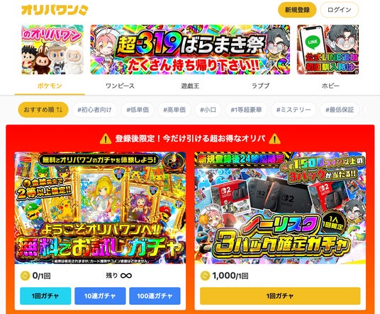 高還元率ガチャ・アド確定イベント・独自演出・人気ショップとのコラボなど、ワクワクするオリパ体験”を追求し続けています。