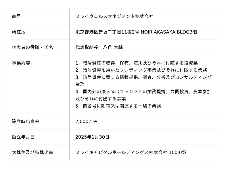 当社のグループ会社である、ミライウェルスマネジメント株式会社(以下、「MWM社」という)は、投資戦略の一環として、ビットコインを追加購入いたしましたので、以下の通りお知らせいたします。