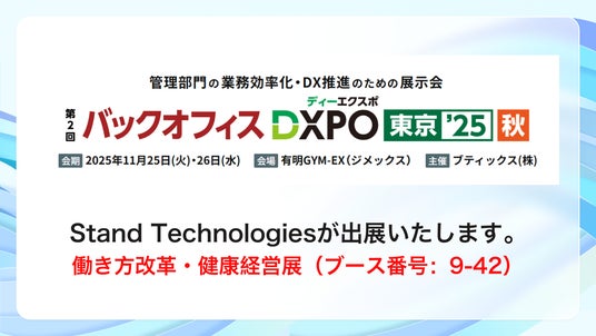 株式会社Stand Technologies(本社:東京都渋谷区渋谷2-12-13 八千代ビル4階、代表取締役 共同代表:河合 真吾・中川 綾太郎)は、2025年11月25日(火)・26日(水)に有明GYM-EXで開催される「第2回 バックオフィスDXPO東京'25【秋】」に出展することをお知らせいたします。