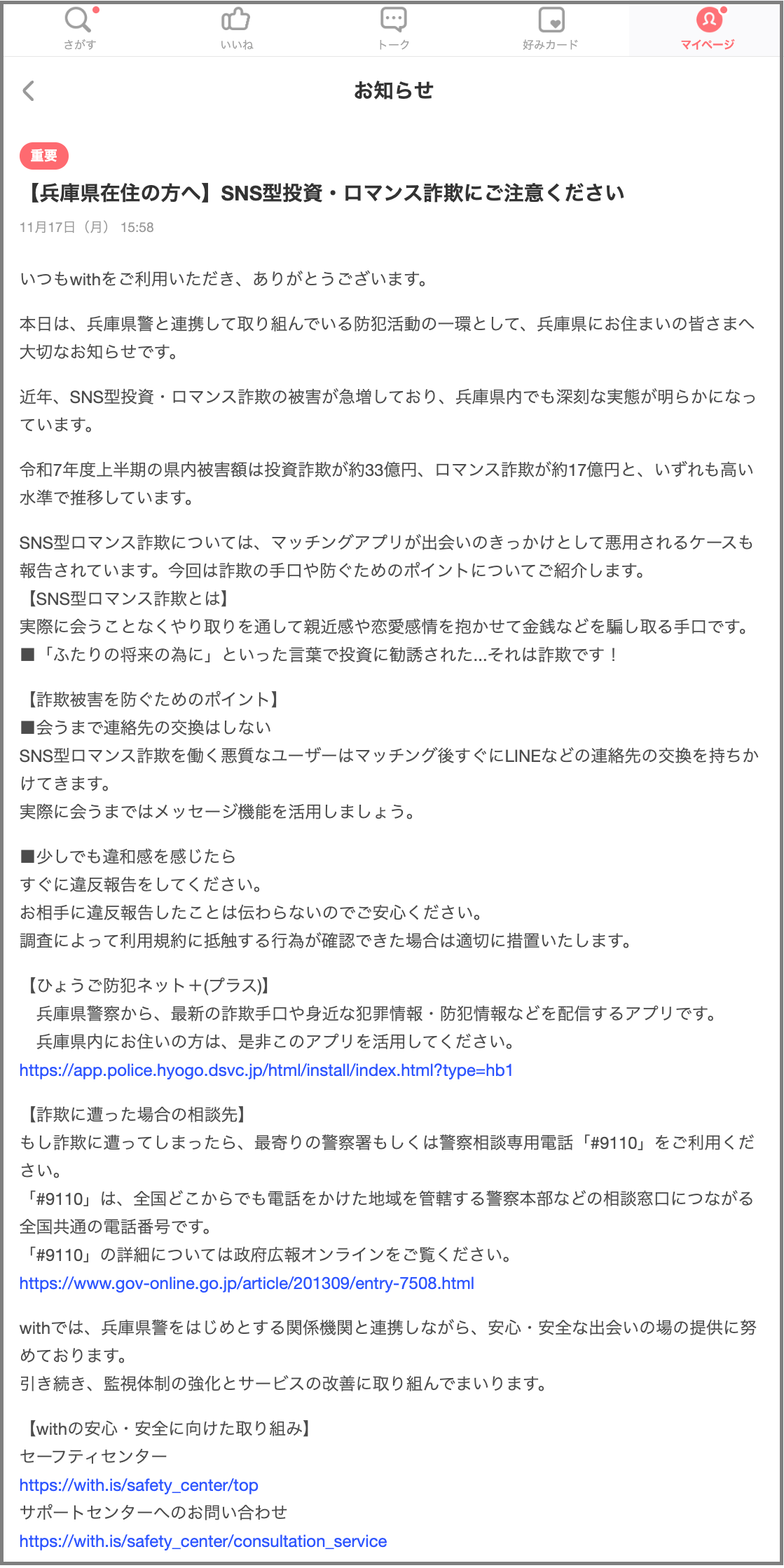 こうした継続的な安全対策に加え、警察庁や各都道府県警察、国民生活センターなどとの定期的な情報交換を実施しており、このたび千葉県警察、和歌山県警察、北海道警察に続き、兵庫県警察と連携して「with」「Omiai」ユーザーを対象にSNS型投資・ロマンス詐欺の手口や対策を紹介し、注意喚起を促す啓発活動の実施に至りました。