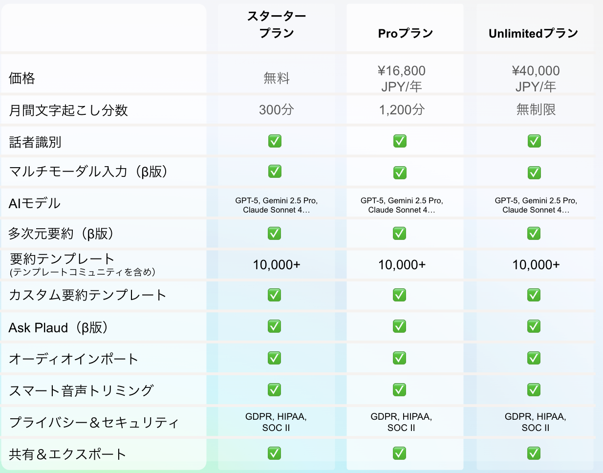 Plaudシリーズは本体を購入するだけで月額無料でAIを活用できます。 3つのプランの違いは「文字起こし時間」のみ、AI機能は最新の内容を含めすべて制限なしでどなたでもご利用可能です。