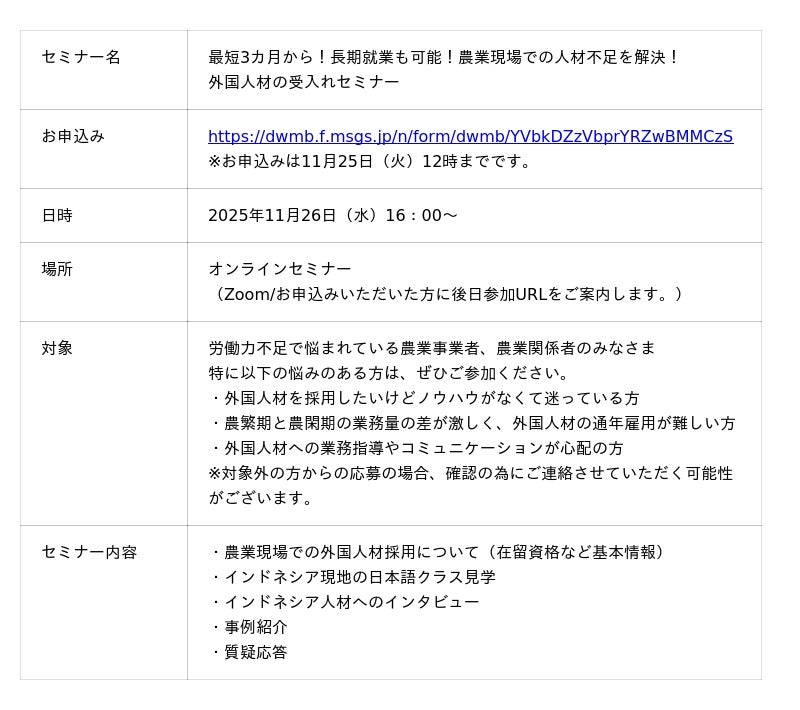 11月26日(水)【特定技能・農業】外国人材受入れセミナー開催!最短3カ月から長期就労の対応も可能!