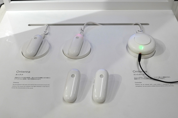Ontennaは、髪の毛や耳たぶ、えり元や袖口などに取り付けて、“光や振動”により音を感じとるデバイス。60~90dBの音を256段階の振動と光に変換することで、音のリズムやパターン、大きさを知覚できる。本体マイクがキャッチする音に反応するシンプルモードと、コントローラーのマイクやボタンで、複数のデバイスを同時制御するスマートモードを備える。