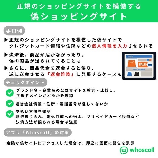 ブランド公式サイトや大手ECサイトを装った「偽ショッピングサイト」による被害が増加しています。購入手続きに進むとクレジットカード情報や住所・電話番号などの個人情報を入力させられ、商品の注文・代金の振込ませた上で、商品を発送しない、または偽物の商品を発送するといったケースもあります。さらに返金を求めた際に、商品代金を返金すると偽り、逆にユーザーに送金させる「返金詐欺」に発展する可能性もあります。