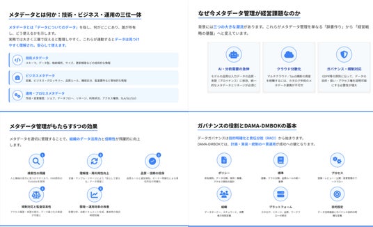 本資料は、定義から国際標準、アクティブ・メタデータによる自動化、代表ツールの選定軸、90日PoCの設計、KPIとROIまでを一気通貫で解説します。