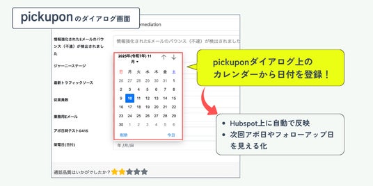 音声×営業DXを推進するpickupon株式会社(千葉県市川市、代表:小幡洋一)は、音声議事録AI「pickupon(ピクポン)」とCRMツール「HubSpot」との連携機能をアップデートし、新たにカレンダー選択型の「日付プロパティ(Date picker)」との連携を開始しました。この新たな機能連携により、pickupon上での通話中または終話直後に、HubSpot上の「日付」タイプの項目をカレンダーから直接選択・入力できます。