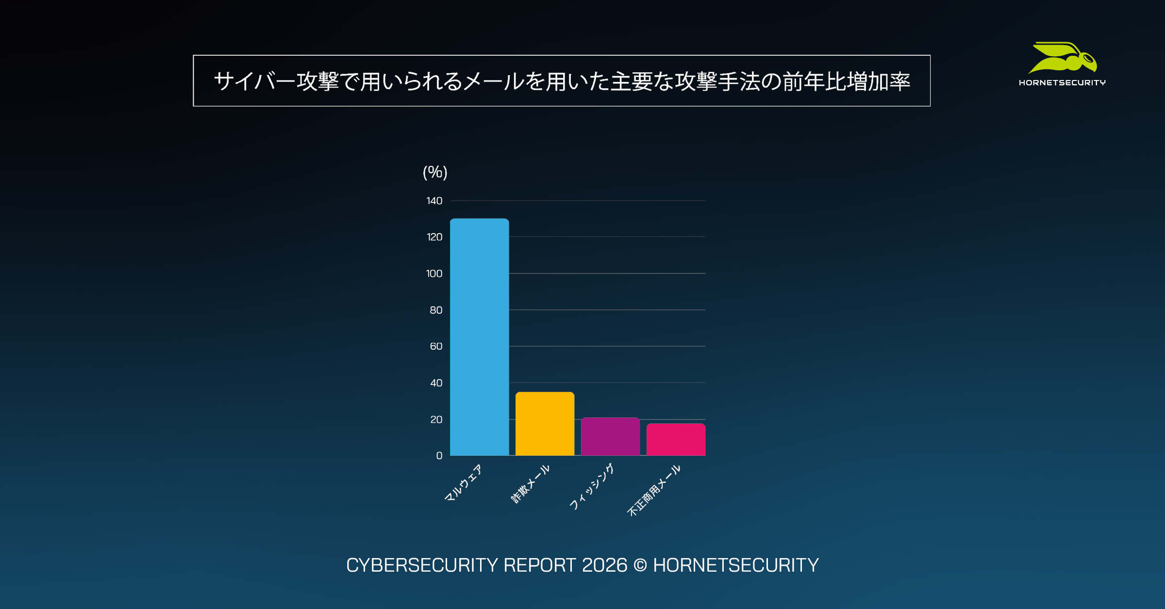 本調査は、Hornetsecurityが720億件のメールを分析して得た結果に基づいています。2025年もメールが依然として主要なサイバー攻撃の侵入経路であることが確認され、前年に比べて、マルウェアを含むメールは131%増加、詐欺メールは34.7%増加、フィッシングは21%増加したことが明らかになりました。