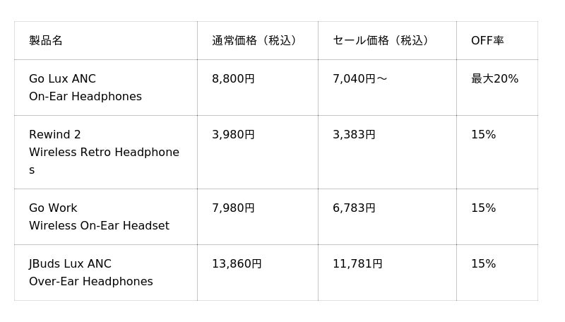 2024年度に100ドル以下のスポーツイヤホンと50ドル以下のワイヤレスイヤホンのカテゴリーで全米売上No.1(※1)を獲得した「JLab」の日本法人、JLab Japan株式会社(本社:東京都港区、代表取締役:横張 亮輔)は、2025年11月21日(金)0:00 ~ 2025年11月23日(日)23:59 まで開催される「Amazonブラックフライデー先行セール」および、2025年11月24日(月)0:00 ~ 2025年12月1日(月)23:59 まで開催される「Amazonブラックフライデー」において、人気のワイヤレスイヤホン・ヘッドホン等、21製品を最大30%OFFにて販売いたします。