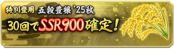 五穀豊穣に関連する武将たちをピックアップした「特別登用・五穀豊穣 '25秋」を開催。10回ごとにSSR武将が確定、30回目にはピックアップ武将が確定で入手できる。