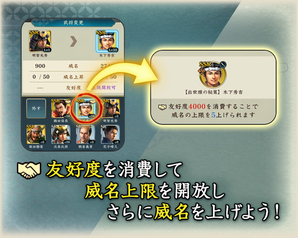 ・直轄地「武家屋敷」にて、威名を50まで上昇させている武将の武将友好度を消費してさらに威名を上昇させられる機能を追加