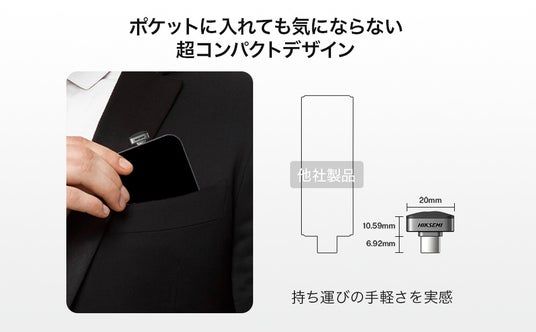 わずか 10.59mm × 6.92mm × 20mm の超小型ボディで、USBメモリより小さく、ポケットやポーチに入れてもかさばらない人気モデル。
