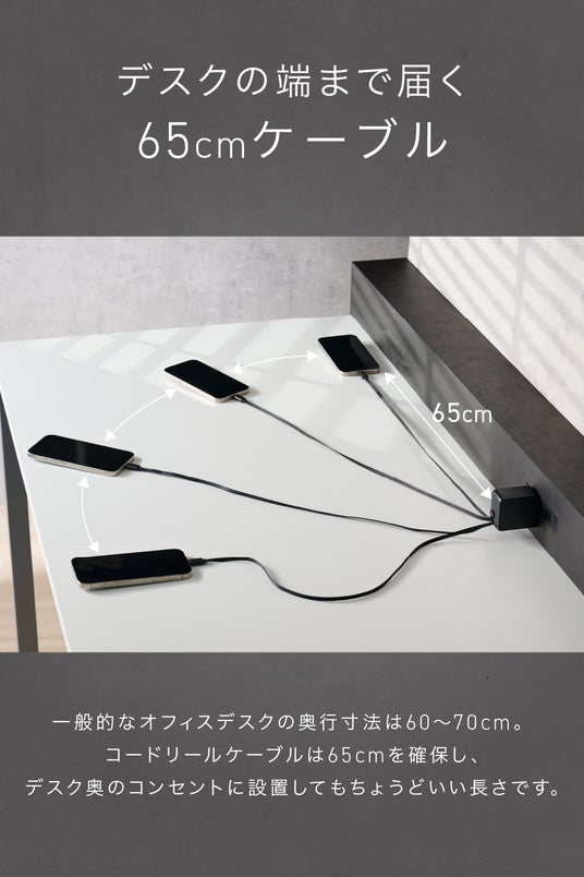 ケーブルを収納できるリール構造により、コンセントまわりやデスクがごちゃつかず、未使用時も美しい景観を保ちます。ほこりの付着も抑え、
