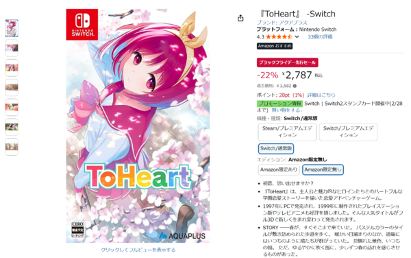 2025年11月21日から開催中の「Amazonブラックフライデー先行セール」。ここでは、アクアプラスより発売中のNintendo Switch用恋愛アドベンチャーゲーム「ToHeart(トゥハート)」がお買い得だったので紹介していこう。
