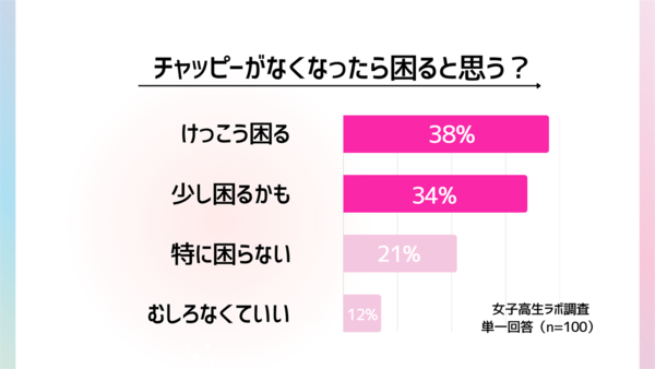 また、全体の7割超にあたる72%が、「チャッピーがなくなったらけっこう困る/少し困るかも」と回答している。チャッピーは女子高生のあいだで、勉強や情報収集に使うだけでなく、相談相手としても欠かせない存在になっているというわけだ。