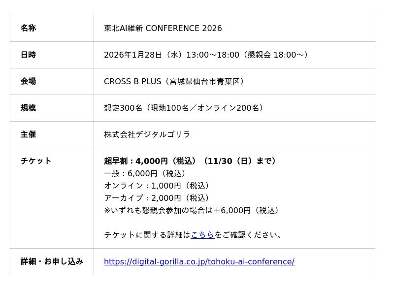 株式会社デジタルゴリラ(本社:宮城県仙台市、代表取締役:菊池 習平)は、2026年1月28日(水)に開催する東北初の大規模AIイベント「東北AI維新 CONFERENCE 2026」の全登壇者およびプログラムを決定したことをお知らせいたします。