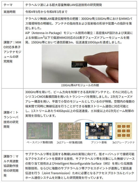 株式会社国際電気通信基礎技術研究所(以下「ATR」)、国立大学法人東京科学大学、学校法人千葉工業大学、国立研究開発法人情報通信研究機構(以下「NICT」)、ザインエレクトロニクス株式会社、国立大学法人広島大学、国立大学法人名古屋工業大学、学校法人東京理科大学、独立行政法人国立高等専門学校機構徳山工業高等専門学校、国立大学法人東北大学、シャープ株式会社の11者は、150GHz帯、および300GHz帯を用いた超大容量無線LANの研究開発を共同で行い、「端末搭載可能な超小型多素子アンテナモジュール化技術(RF-IC、アンテナ・伝搬解析など)の確立」「300GHz帯で2次元フェーズドアレーにより30度のビーム制御が可能なトランシーバの実現」「150GHz帯双方向通信システム、伝搬路制御技術、および無線リソース制御技術、ならびに複数周波数帯を活用した接続先アクセスポイント検出技術の確立」などの成果を得ることができました。本研究成果は本年11月26~28日にパシフィコ横浜で開催されるMWE2025で展示されるとともに、11月27日のワークショップ「テラヘルツ波による超大容量無線LANの実現に向けた最新技術動向」でも説明されます。