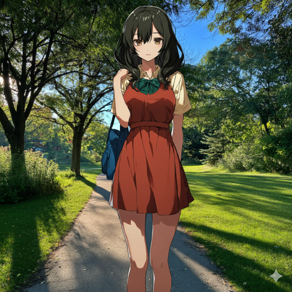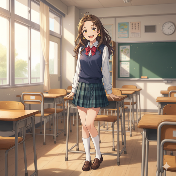 プロンプト:このキャラが制服姿で教室にいる絵を描いて