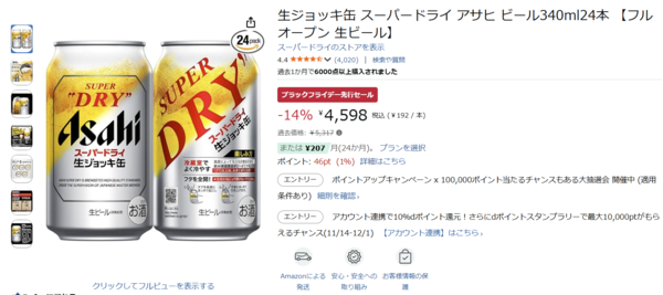 フルオープンする缶フタからきめ細かい泡が自然にわき出る、まるでお店の生ジョッキのような味わいを自宅で楽しめます。過去価格5,317円のところ、Amazonブラックフライデー先行セールでは14%OFFの4,598円で購入できます。