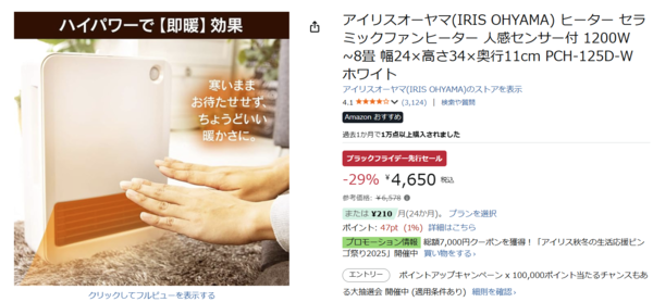 【Amazonブラックフライデー先行セール】アイリスオーヤマ セラミックファンヒーター 人感センサー付き 1200W PCH-125D-W登場!