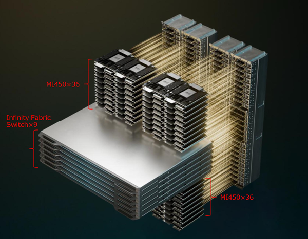 これを見ると、下の画像のようになるはずだ。要するにMI450同士を直接相互接続しているとスケーラビリティに欠けるので、NVLinkと同様にこちらもインフィニティ・ファブリック・スイッチを間に挟んだのだろう。