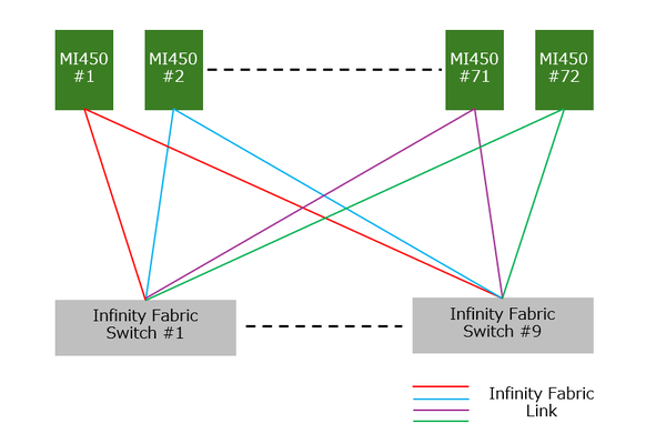 この場合の接続図は下図のようになるであろう。1枚のMI450から9本のインフィニティ・ファブリック・リンクが出て、それが9枚のスイッチにそれぞれ接続される格好だ。この構造は、隣接するMI450同士であってもスイッチを挟むことで2-hopとなり、ややレイテンシーの面では不利ではあるが、その代わり72枚まで規模を2-hopのままで拡張できる。