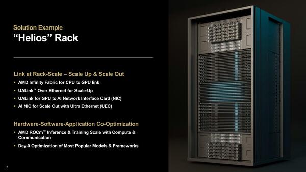 実は、Instinct MI450の世代ではHeliosというラックが提供されることがすでに公開されている。このHeliosの中身が下の画像で示されている。