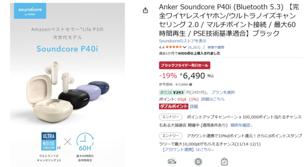 【Amazonブラックフライデー先行セール】完全ワイヤレスイヤホン Anker Soundcore P40i登場!