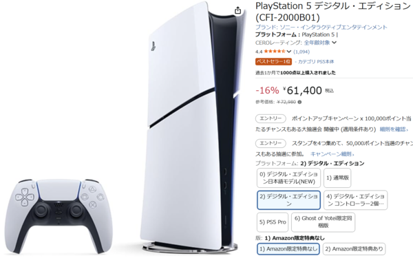 「PlayStation 5 デジタル・エディション(CFI-2000B01)」は、参考価格72,980円から16%オフの61,400円に!
