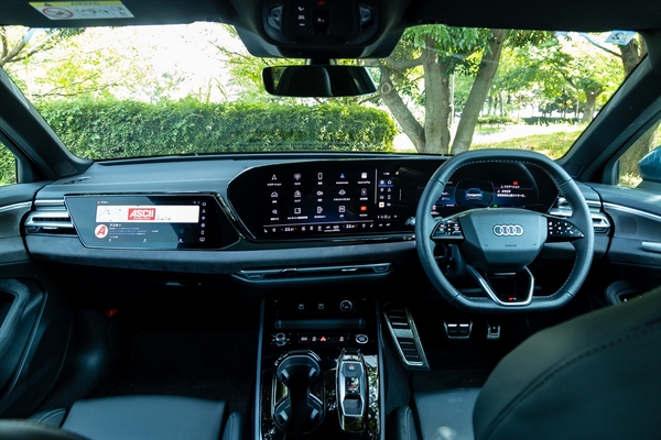 運転席は今までのアウディとは一線を画すもの。センターディスプレイと一体化したカーブドディスプレイは、運転席側が11.8インチ、センター側が14.5インチと大画面。そして、ハンドルの上下が少し直線形状の近未来デザインになっていました。