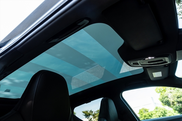 天井は今ハヤリの、ボタン1つで透明度が変わるパノラマガラスルーフ(33万円)が取り付けられていました。他社の場合、オンオフの2段階ですが、アウディは9分割で前だけ明るくする、といった調光が可能。遊び心があります。