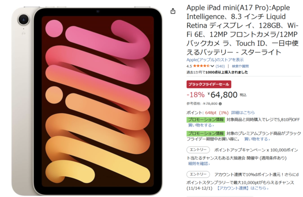 Appleの高性能タブレット「iPad mini(A17 Pro)」(128GB、Wi-Fiモデル)が、Amazonブラックフライデーセールに登場中です。