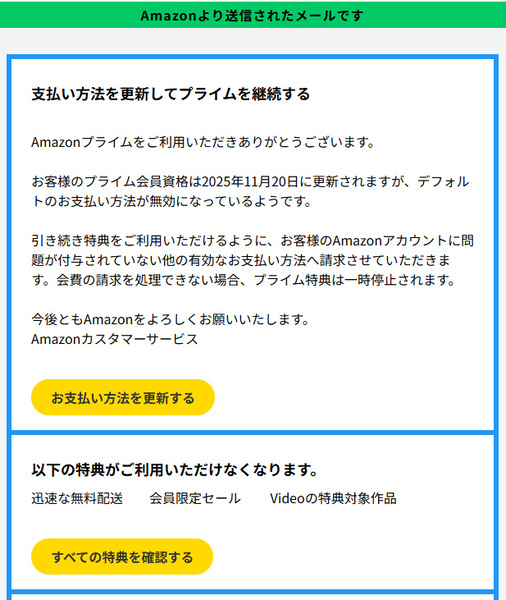 支払い方法に不備があります/セキュリティ対策でアカウント制限中/カード利用額が確定。利用明細はこちら」などなど、さまざまなバリエーションがありますが、「ブラックフライデー中に送料無料になるプライム会員を外されてしまうのはマズい!」などと慌ててURLやボタンをタップするのは絶対NG。その先は、すべて詐欺師が作った偽Webサイトです。