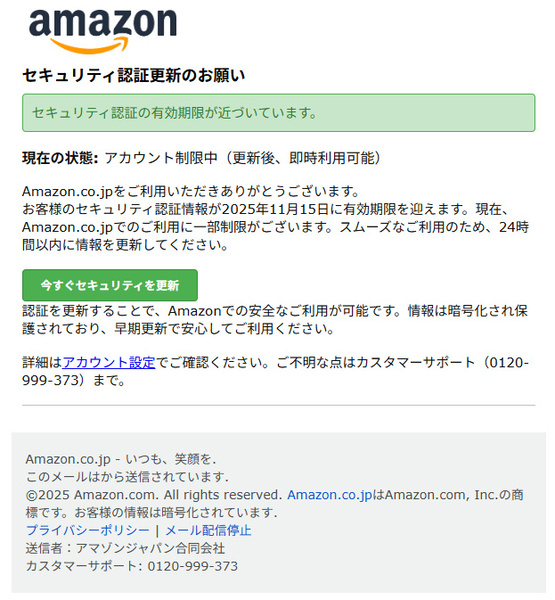 たとえばフィッシング対策協議会の発表によると、昨年(2024年)11月のフィッシング報告件数は17万8593件。そのうちAmazonを騙ったものは約4万1000件と全体の22.9%を占めていました。つまり、5通に1通が「自称Amazon」だったわけです。