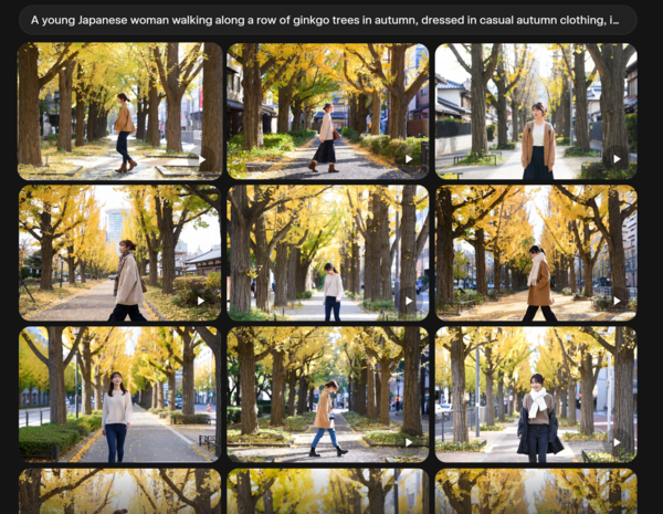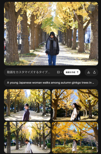例として、「秋のイチョウ並木を秋のカジュアルの服装で歩いている日本人の若い女性。東京」というプロンプトで生成してみます。プロンプトを入力すると、英語に翻訳され、次々に画像が生成されていきます。画面をスクロールすると、さらに追加で生成されます。