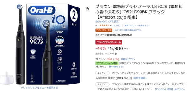 ブラウンの電動歯ブラシ「オーラルB iO2S」がAmazonブラックフライデーセールに登場。