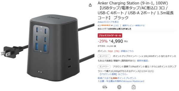 モバイル充電ブランドAnker(アンカー)から、人気の電源タップ「Anker Charging Station(9-in-1, 100W)」がAmazonブラックフライデーセールに登場。