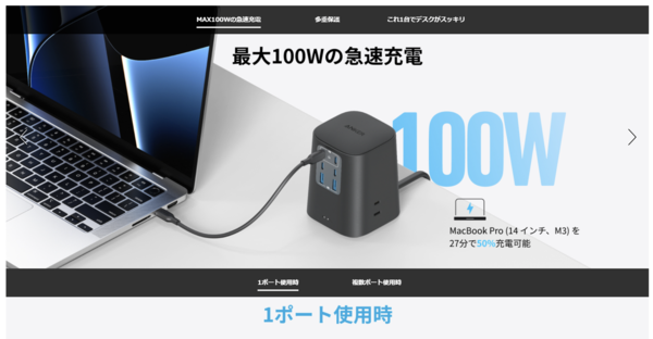 USB-Cポートは最大100W出力に対応し、スマホやタブレットの充電はもちろん、MacBook Pro(14インチ、M3)を27分で50%充電できます。