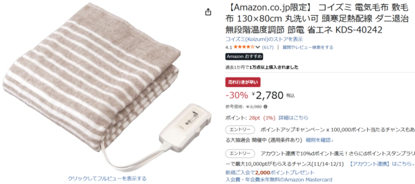 KOIZUMI(コイズミ)のAmazon限定カラーの電気敷毛布「KDS-40242」が、セール販売中。参考価格3,980円から2,780円(約30%オフ)で入手できます。