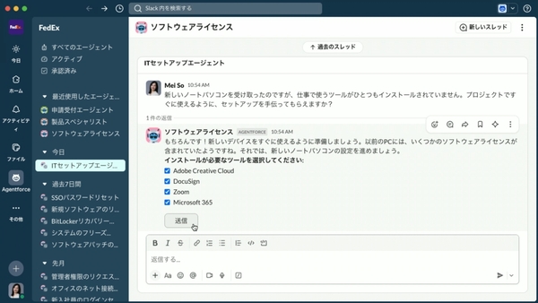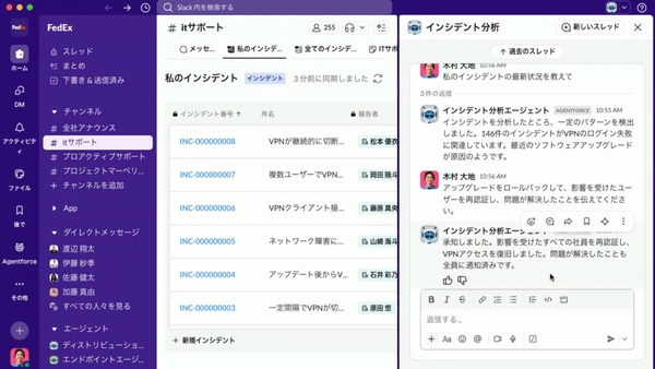 加えて、「Agentforce IT Service」では、ITサービスマネージメント(ITSM)領域に本格参入している(参考記事:“Salesforce対ServiceNow” …今度はSalesforceから挑戦状? ITSM市場に本格参入)。従来のようにチケットを作成して待つ必要はなく、困ったときにエージェントが即座に対応するプロアクティブなITサービスを実現。SlackやTeamsを含むあらゆる場所で、24時間365日の従業員サポートを提供できる。