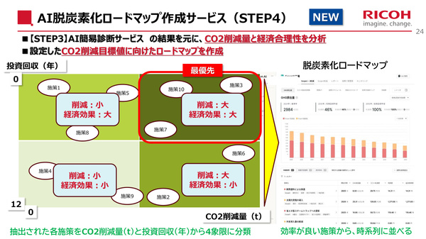 加えて、AIを活用したサービス強化にも乗り出している。具体的には、環境経営レポートなどの公開情報をAIに学習させてGXの推進方法の洗い出しを行うほか、AIを活用した簡易診断サービス、脱炭素化ロードマップ作成サービスなどを開始している。