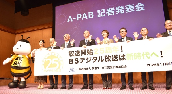 一般社団法人 放送サービス高度化推進協会(A-PAB)が、11月21日に記者発表会を開催。「放送開始25周年!BSデジタル放送は新時代へ!」というスローガンの下、NHK専務理事およびBS民放5社(BS日本・BS朝日・BS-TBS・BSテレビ東京・ビーエスフジ)の社長が一堂に会し、NHKおよびBS民放5社による共同キャンペーンの展開を紹介。各社の25周年記念特番に加え、NHKからは4K8Kの選りすぐりの番組ラインナップ、BS民放5社からは局の垣根を越えた『BS開局25周年!5局でコラボWEEK』(11月23日からスタート)の詳細が発表された。