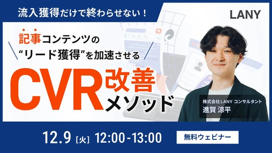デジタルマーケティング支援を提供する株式会社LANY(東京都渋谷区、代表取締役社長:竹内渓太)は、【無料ウェビナー】流入獲得だけで終わらせない! 記事コンテンツのリード獲得を加速させるCVR改善メソッドを12/9(火)に開催いたします。