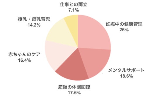 妊婦の関心は、妊娠期の体調管理やメンタルケアに高く集中する一方で、産前・産後ケアや赤ちゃんのお世話、授乳支援にも強い関心があることが明らかになりました。妊娠から産後まで、身体・心・育児に関わる多面的な課題に早期かつ継続的に寄り添う支援のニーズが浮き彫りになっています。