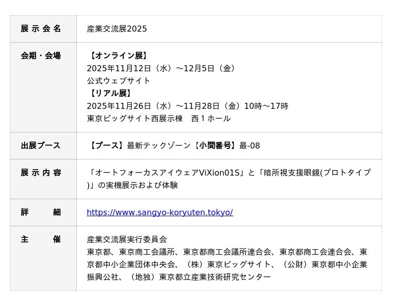 オートフォーカスアイウェア「ViXion01S」を開発・販売するViXion株式会社(東京都中央区、代表取締役社長:南部誠一郎、以下ViXion)は、2025年11月26日(水)から11月28日(金)に東京ビッグサイトで開催される「産業交流展2025」に出展し、最新テクノロジー技術を活用した2つの視覚支援デバイス「オートフォーカスアイウェア ViXion01S」、および「暗所視支援眼鏡(新モデル)」のプロトタイプを展示します。